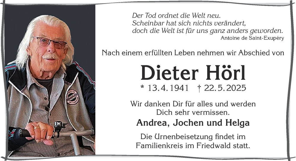 Hier finden Sie alle Traueranzeigen aus der Zeitung, die bisher für Dieter Hörl erschienen sind. Weitere Traueranzeigen, die in der Zeitung erscheinen, werden hier ebenfalls aufgelistet