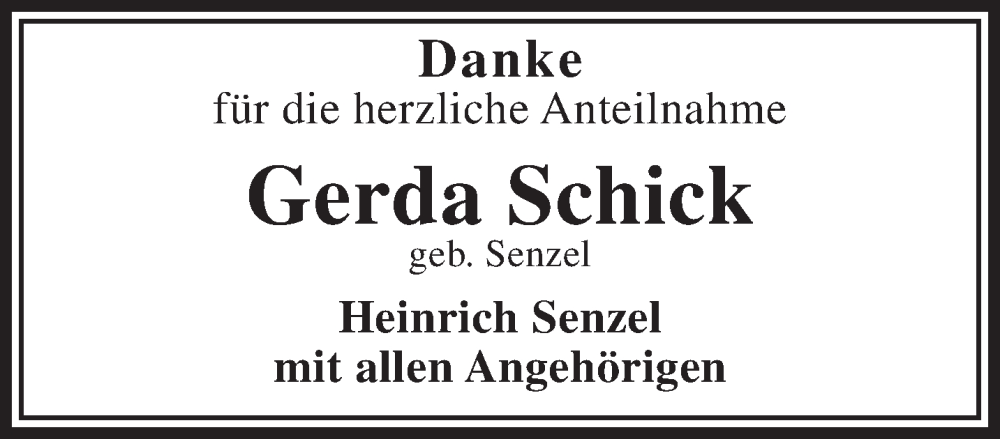 Hier finden Sie alle Traueranzeigen aus der Zeitung, die bisher für Gerda Schick erschienen sind. Weitere Traueranzeigen, die in der Zeitung erscheinen, werden hier ebenfalls aufgelistet