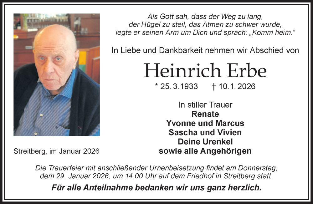 Hier finden Sie alle Traueranzeigen aus der Zeitung, die bisher für Heinrich Erbe erschienen sind. Weitere Traueranzeigen, die in der Zeitung erscheinen, werden hier ebenfalls aufgelistet