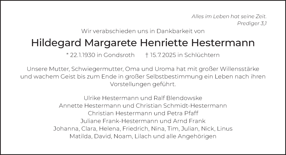 Hier finden Sie alle Traueranzeigen aus der Zeitung, die bisher für Hildegard Margarete Henriette Hestermann erschienen sind. Weitere Traueranzeigen, die in der Zeitung erscheinen, werden hier ebenfalls aufgelistet