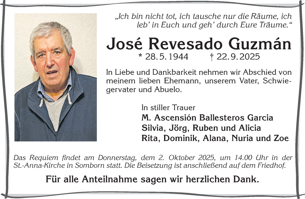 Hier finden Sie alle Traueranzeigen aus der Zeitung, die bisher für José Revesado Guzmán erschienen sind. Weitere Traueranzeigen, die in der Zeitung erscheinen, werden hier ebenfalls aufgelistet