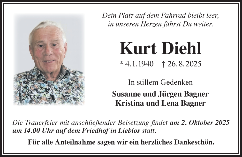 Hier finden Sie alle Traueranzeigen aus der Zeitung, die bisher für Kurt Diehl erschienen sind. Weitere Traueranzeigen, die in der Zeitung erscheinen, werden hier ebenfalls aufgelistet