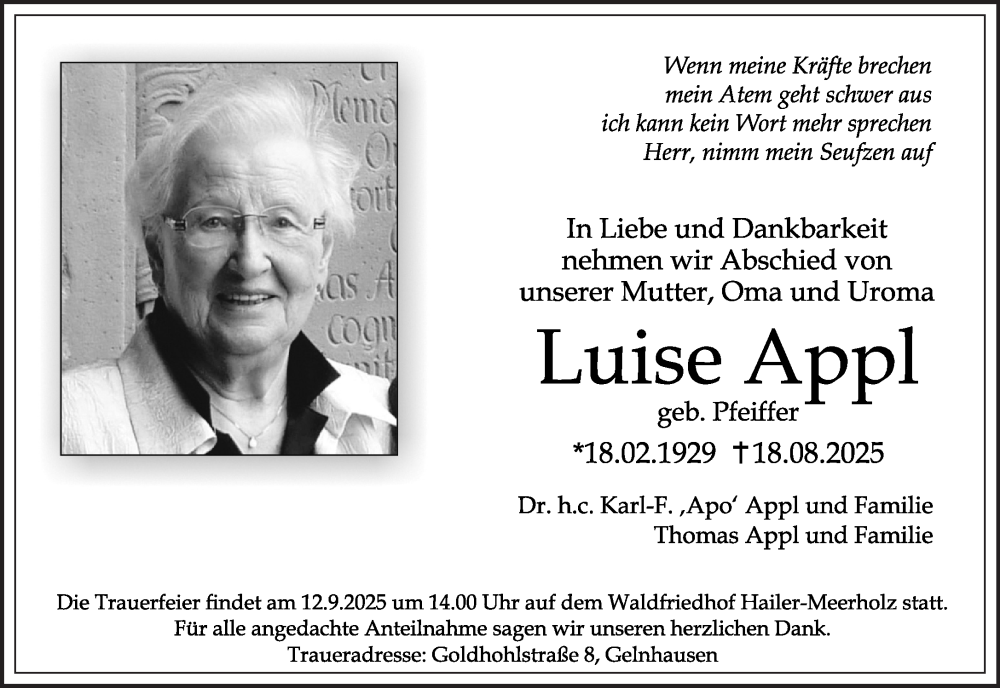 Hier finden Sie alle Traueranzeigen aus der Zeitung, die bisher für Luise Appl erschienen sind. Weitere Traueranzeigen, die in der Zeitung erscheinen, werden hier ebenfalls aufgelistet