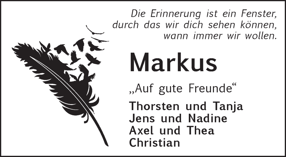 Hier finden Sie alle Traueranzeigen aus der Zeitung, die bisher für Markus erschienen sind. Weitere Traueranzeigen, die in der Zeitung erscheinen, werden hier ebenfalls aufgelistet