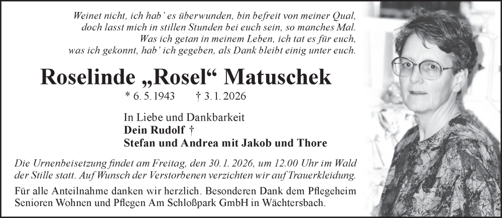 Hier finden Sie alle Traueranzeigen aus der Zeitung, die bisher für Roselinde Matuschek erschienen sind. Weitere Traueranzeigen, die in der Zeitung erscheinen, werden hier ebenfalls aufgelistet