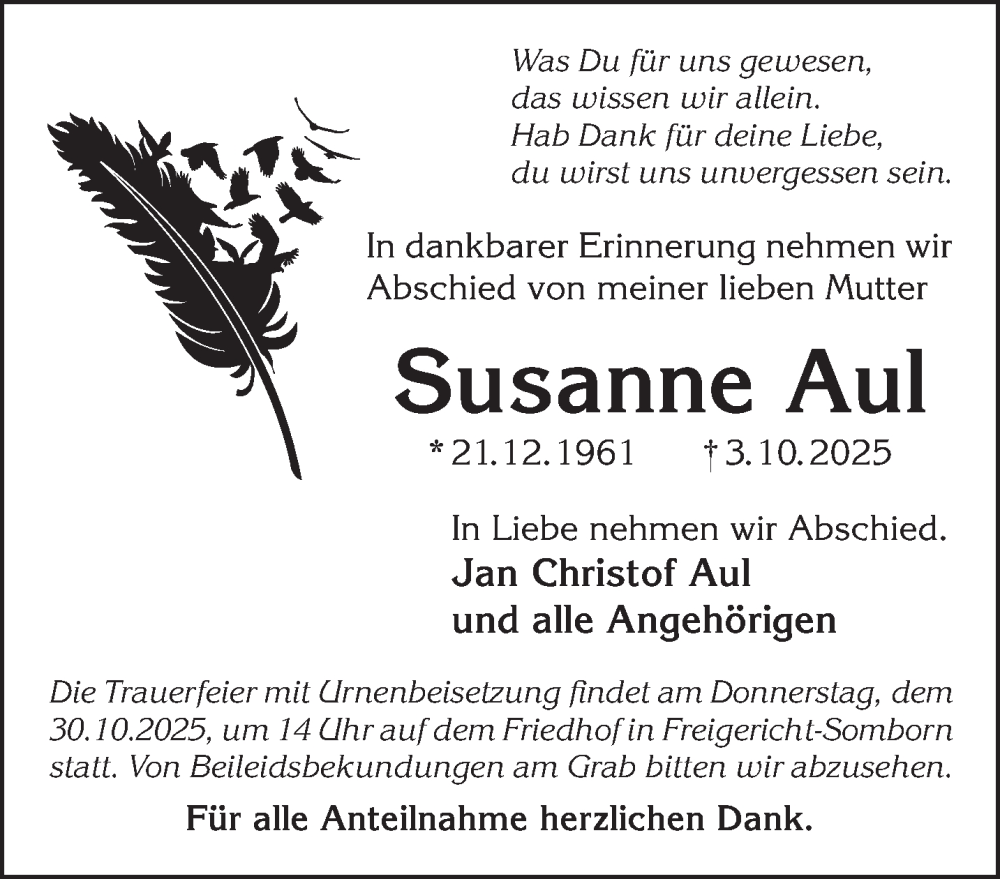 Hier finden Sie alle Traueranzeigen aus der Zeitung, die bisher für Susanne Aul erschienen sind. Weitere Traueranzeigen, die in der Zeitung erscheinen, werden hier ebenfalls aufgelistet